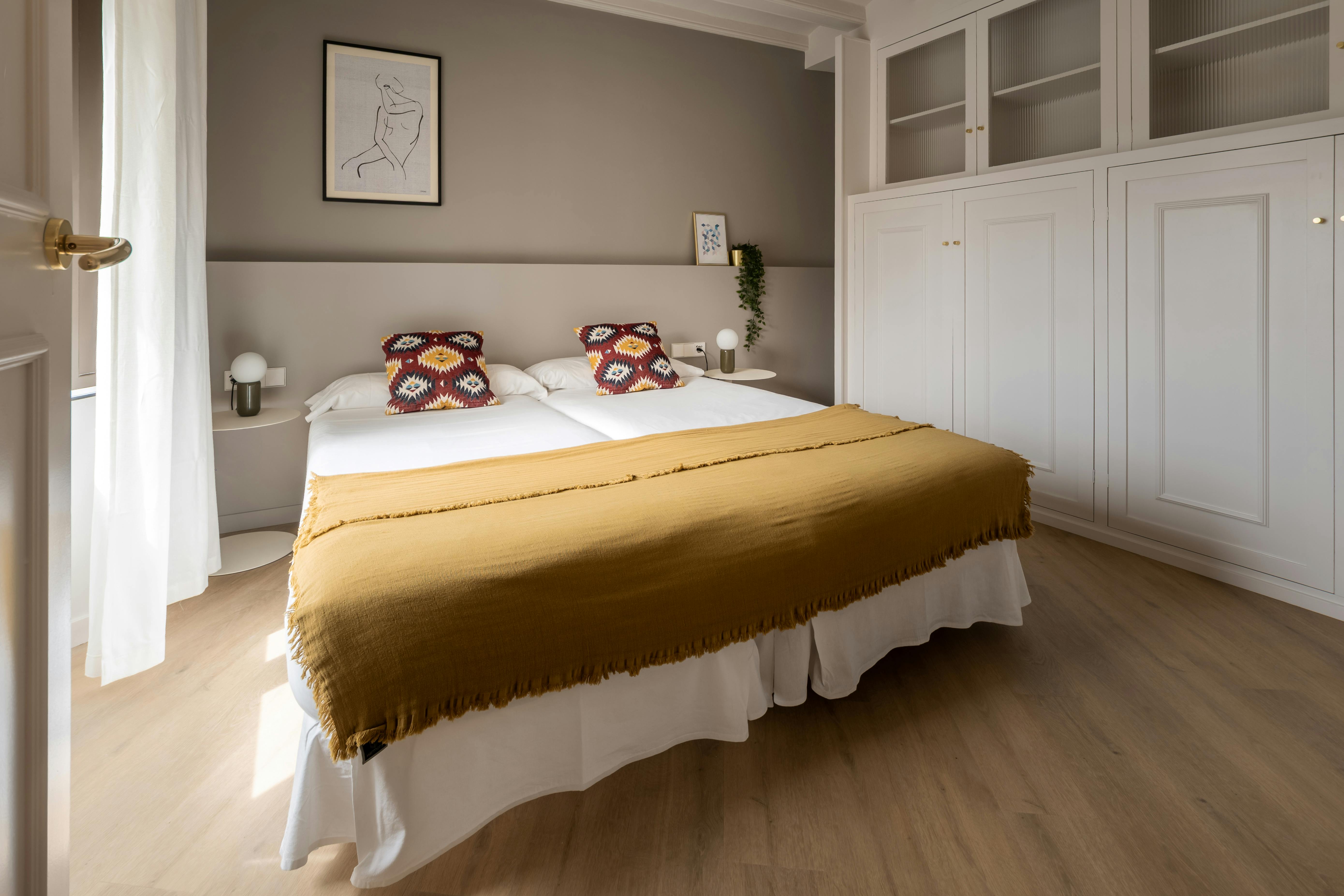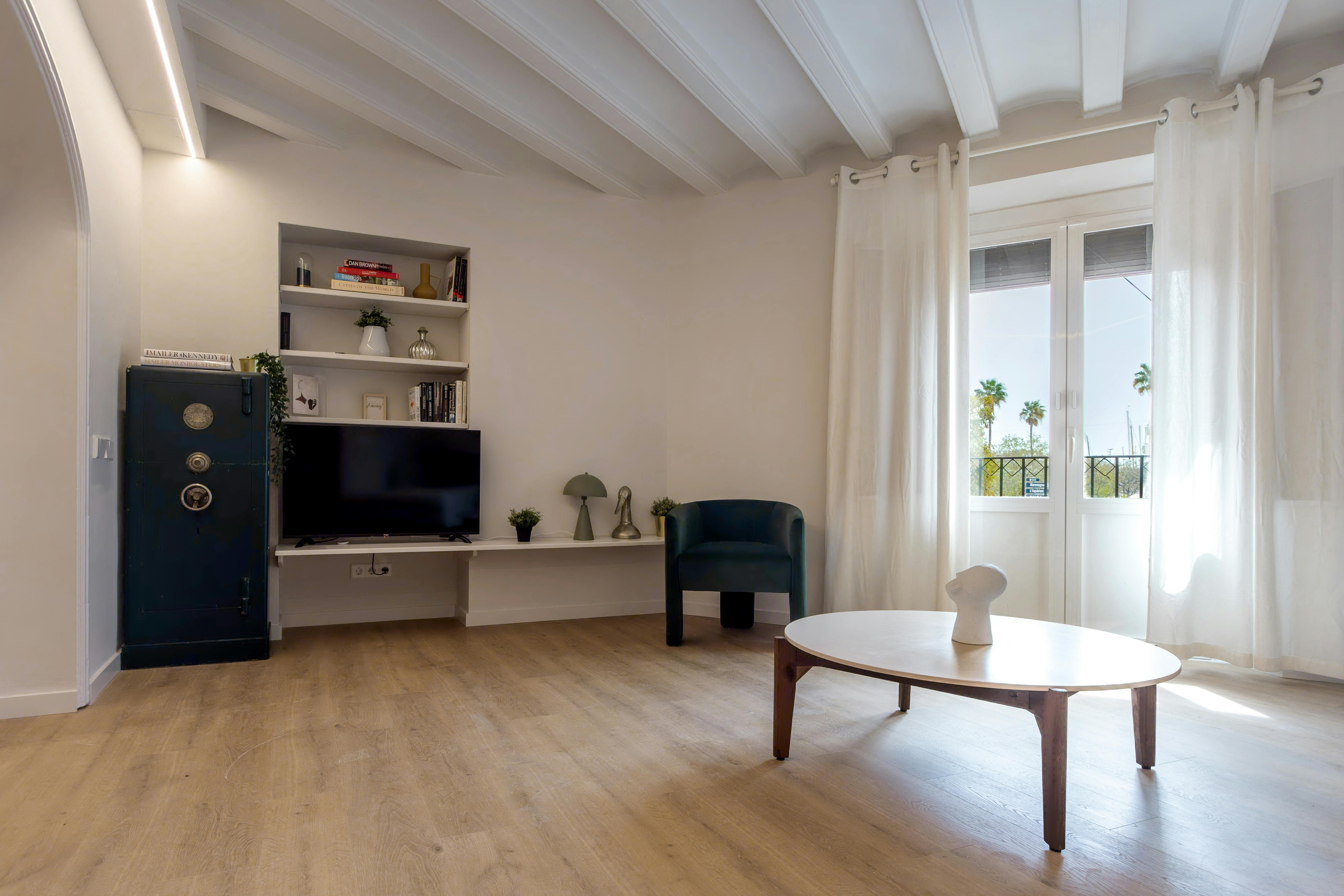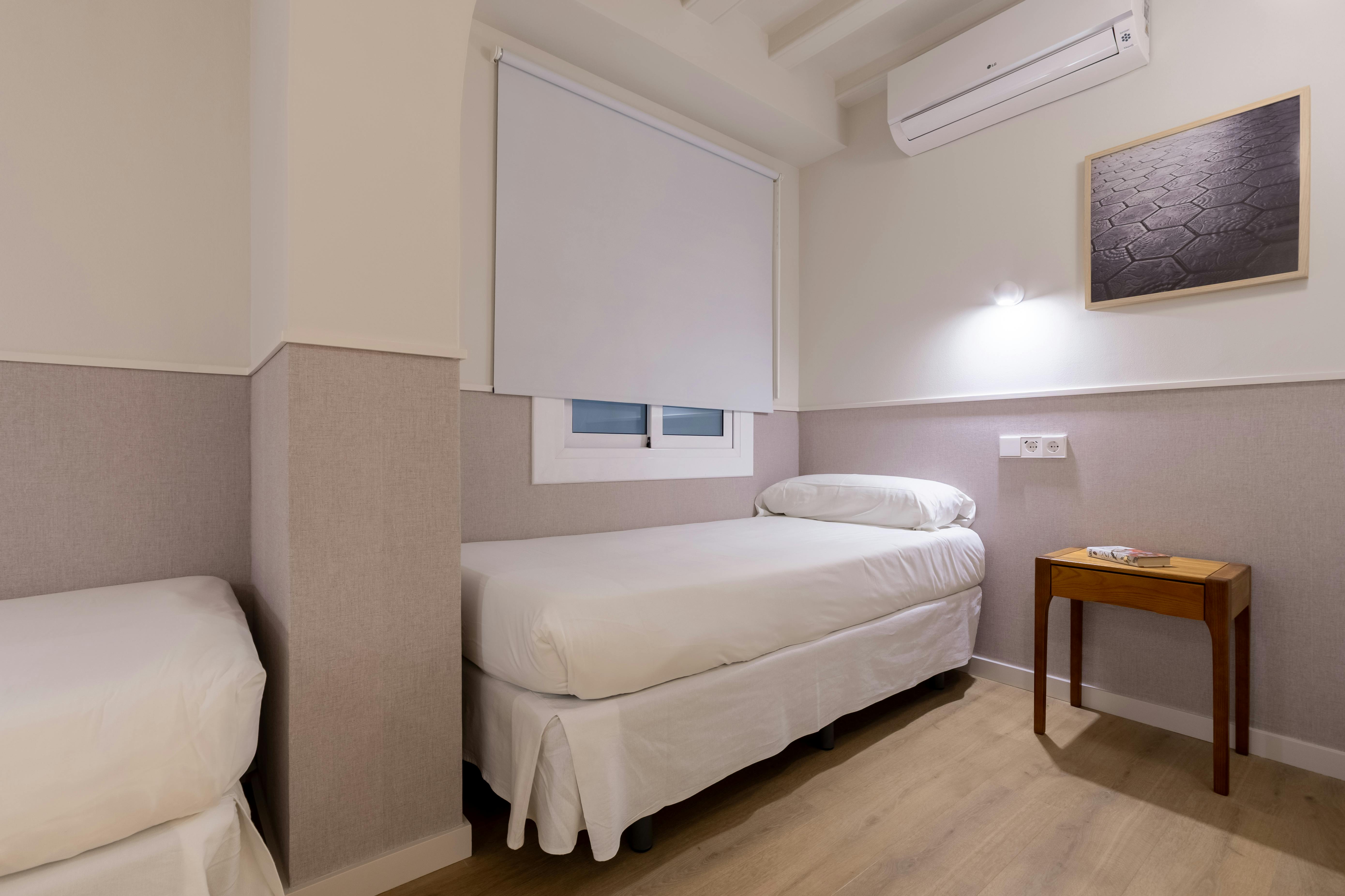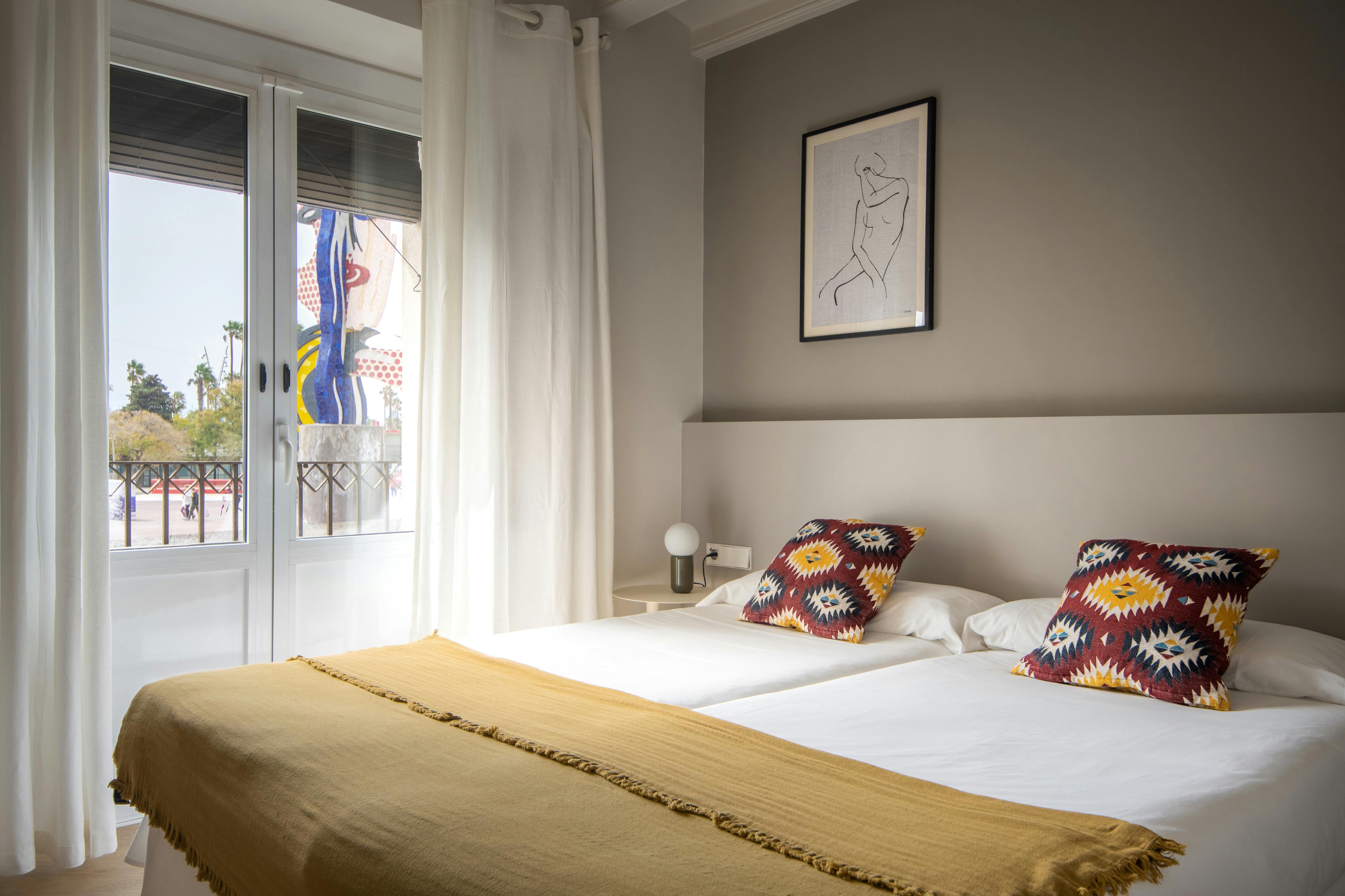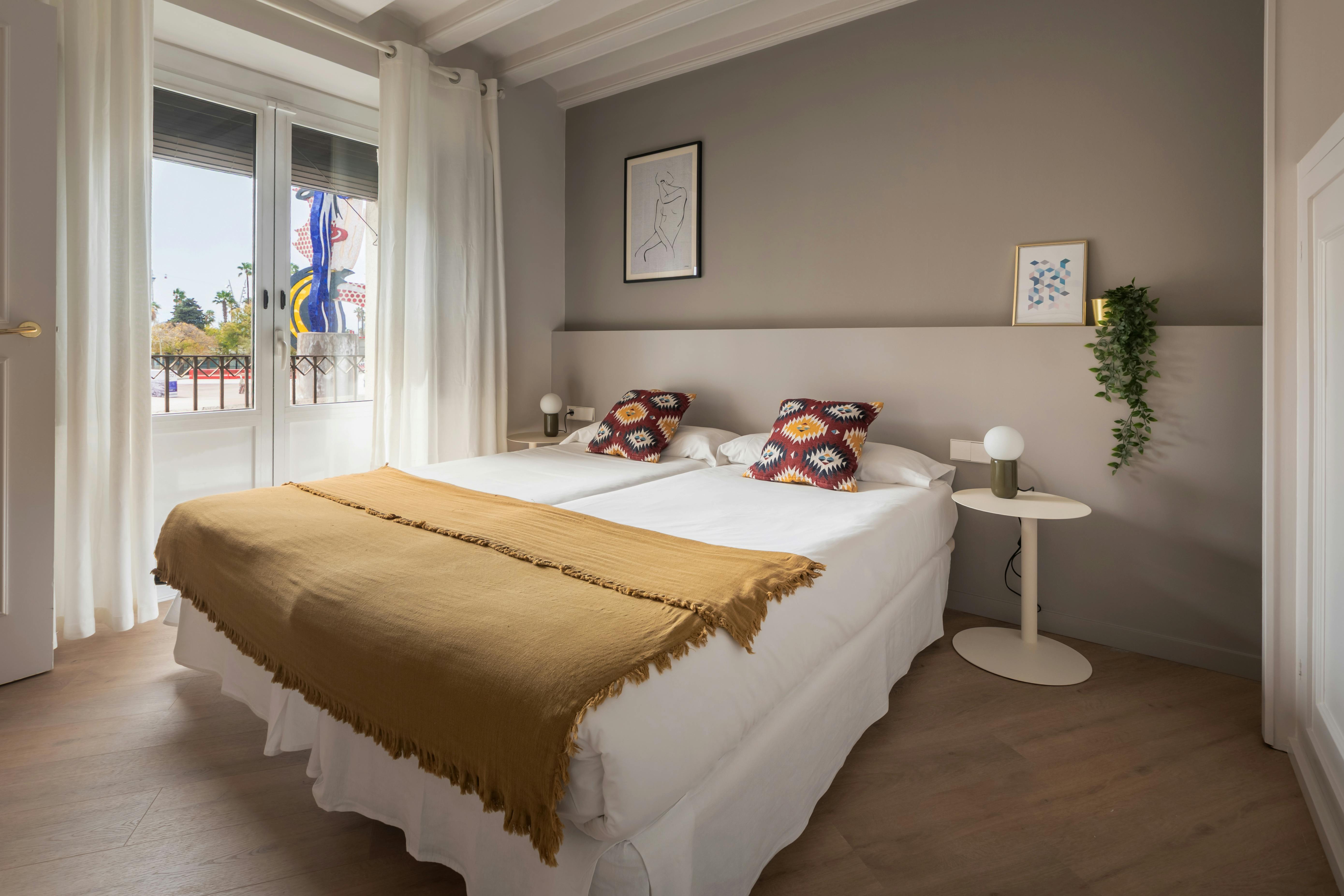 This apartment has three bedrooms: one exterior double room with views of the harbor; a second double room facing Passeig d’Isabel II, offering privileged views of the city's historic buildings; and an interior bedroom with two single beds.