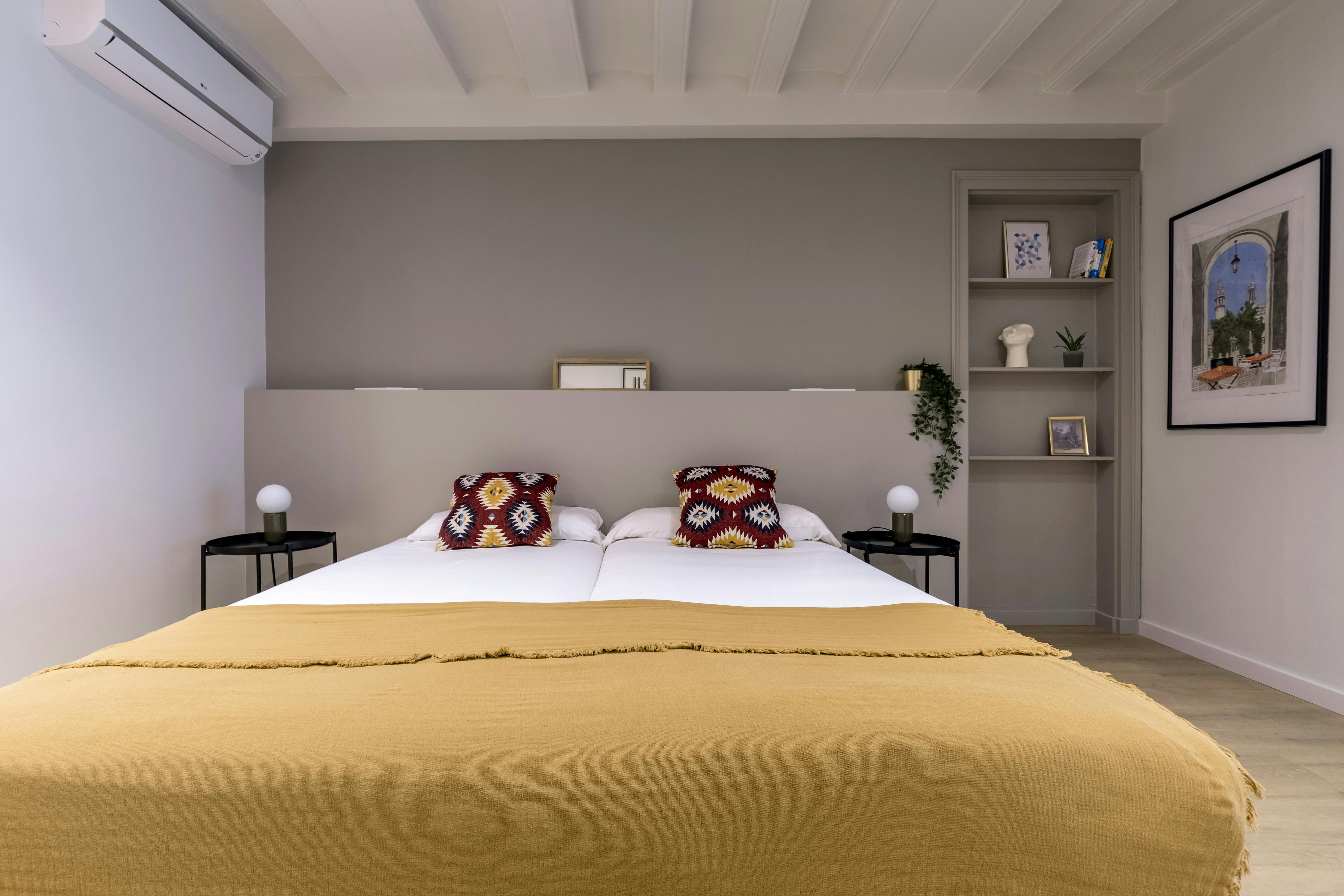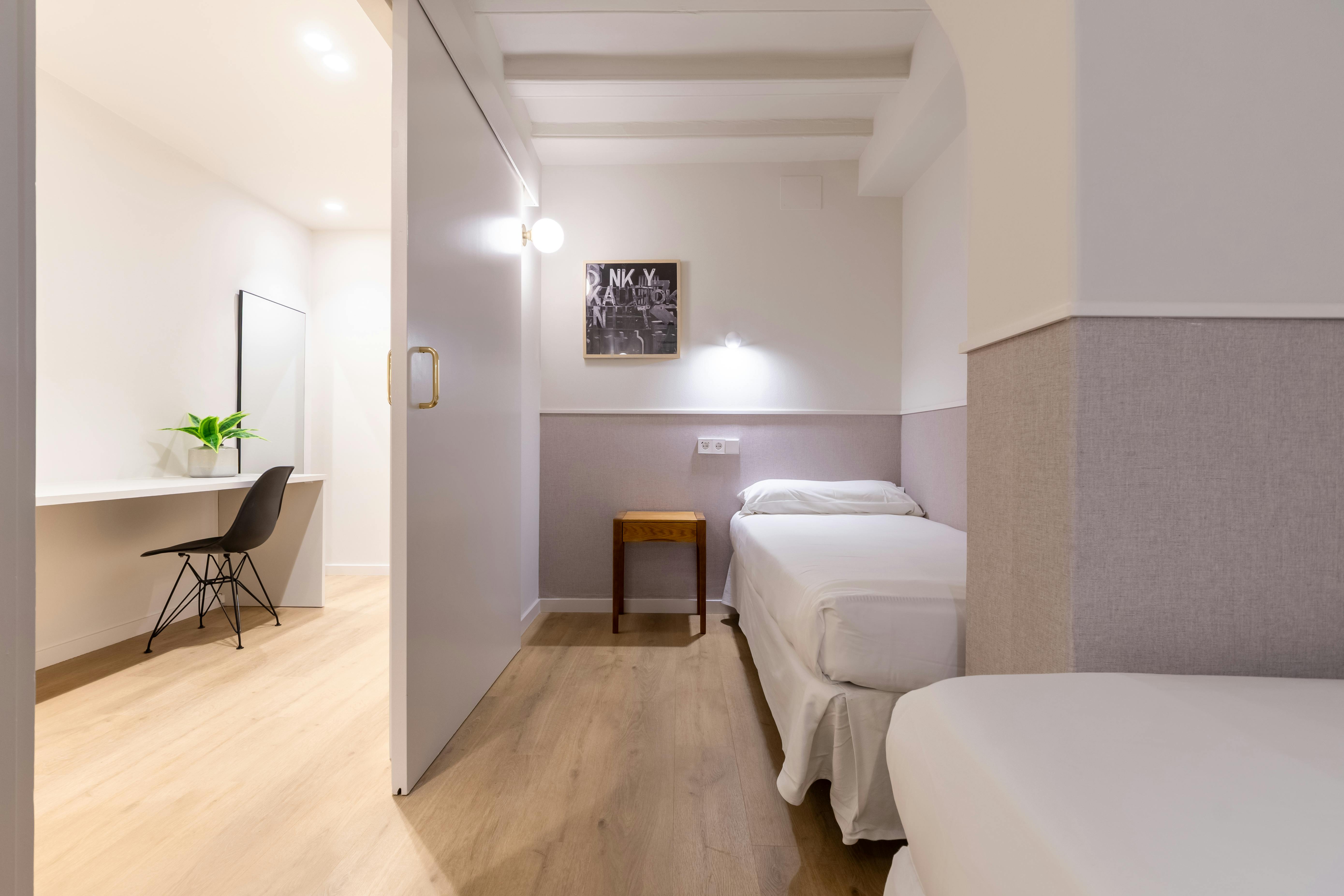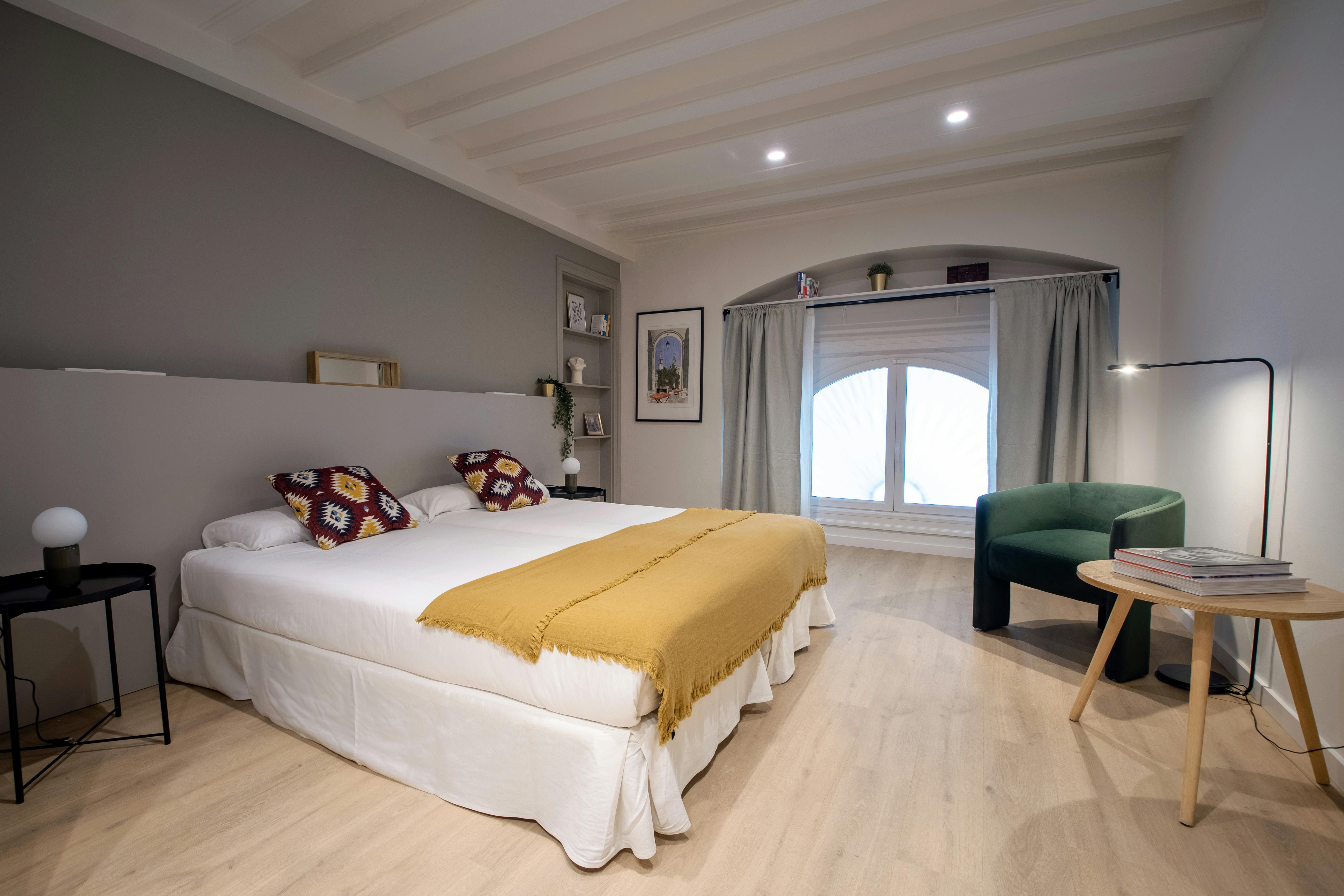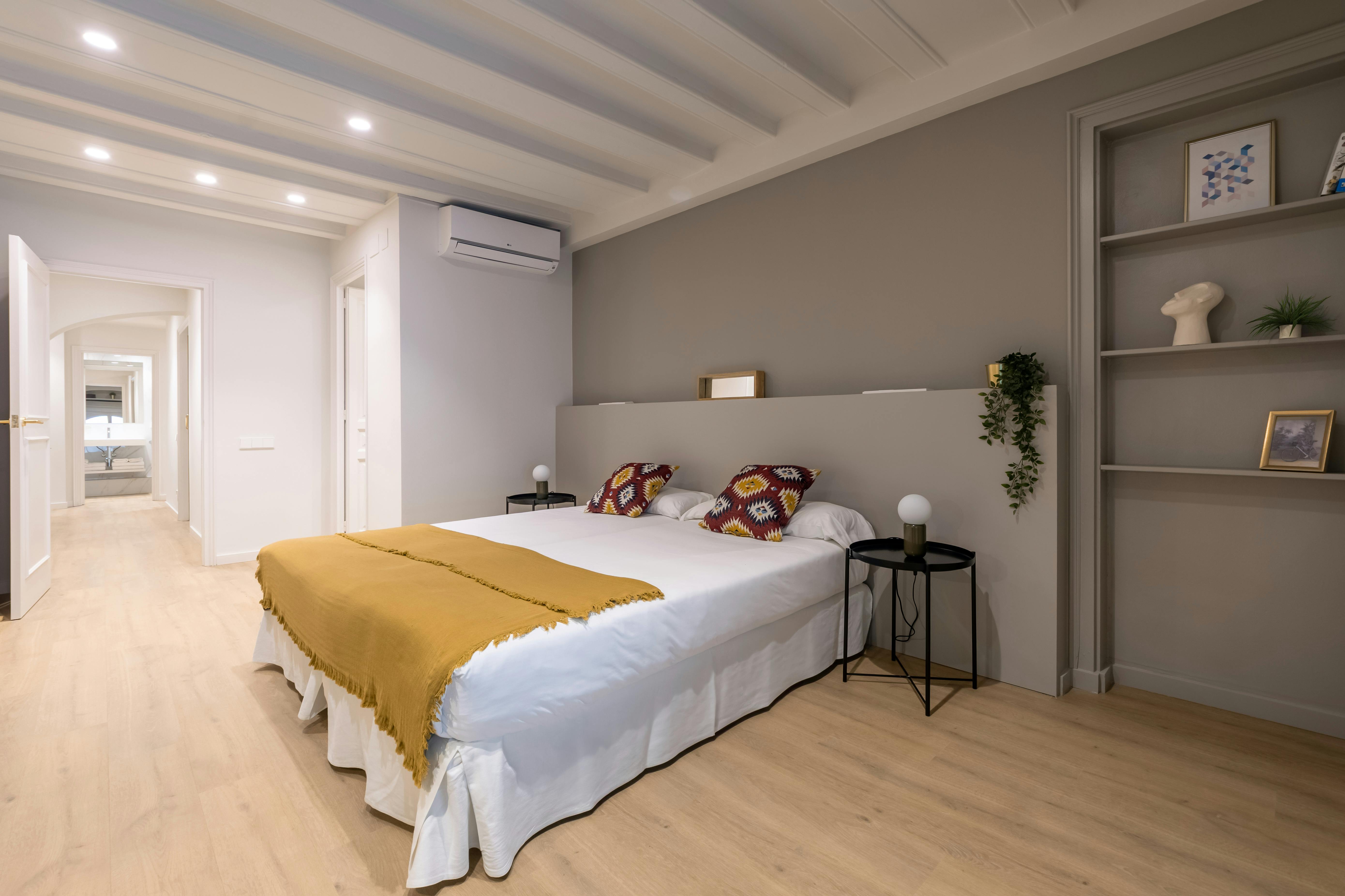 This apartment has three bedrooms: one exterior double room with views of the harbor; a second double room facing Passeig d’Isabel II, offering privileged views of the city's historic buildings; and an interior bedroom with two single beds.